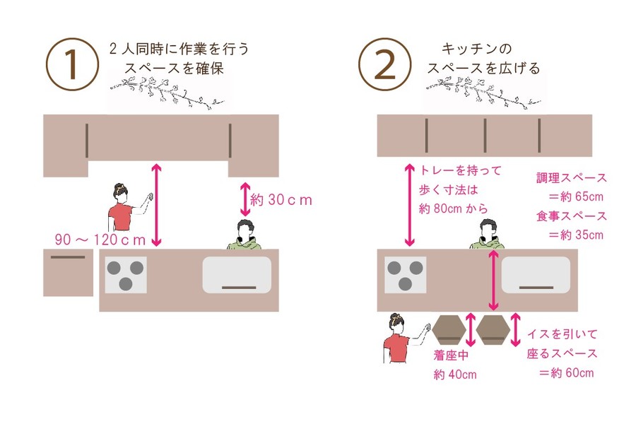 カウンターを並行して配置する際は、90~120cm程度が使いやすい間隔です。